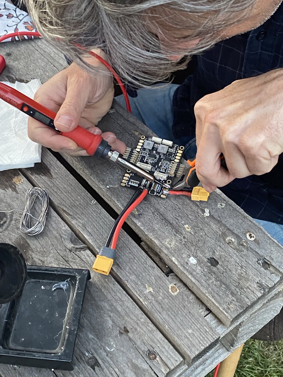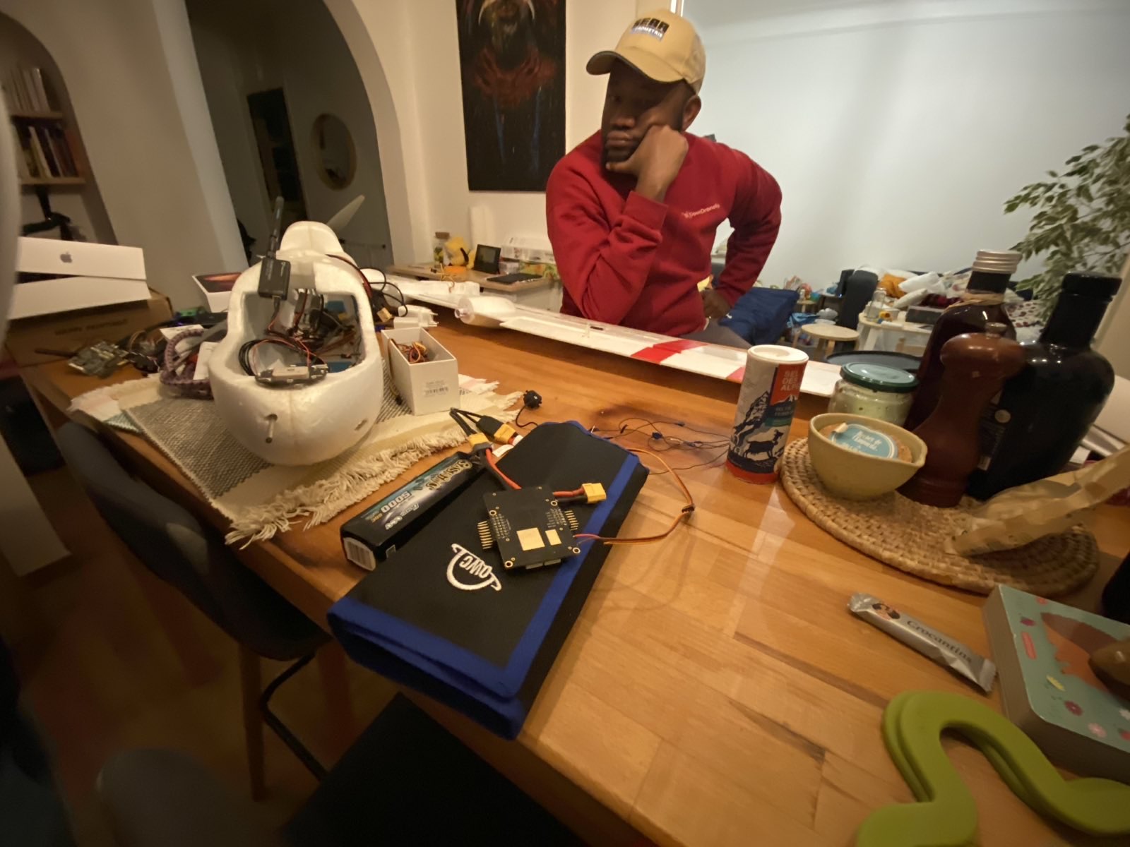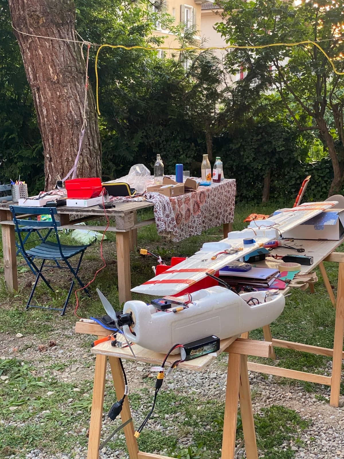 When we arrived, we didn’t have any fixed wings to fly. So Oriol dusted off an old Skyhunter and we started to build it out.