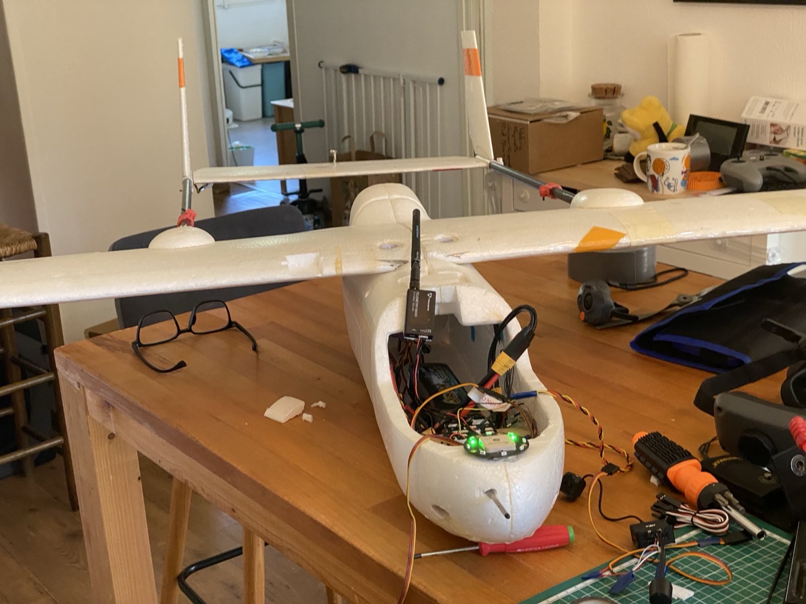 Ok. Maybe that’s his dining room table. It’s hard to say. But the little fixed wing should be flying soon, assuming the compass is willing to cooperate.