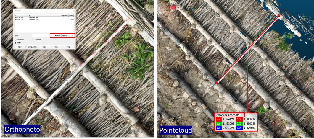 Here an example of measuring a 2m bar in orthophoto (measured in QGIS: 1.91 m long) and in a pointcloud (measured in CloudCompare: 1.9995m long) of the same dataset / processing run.